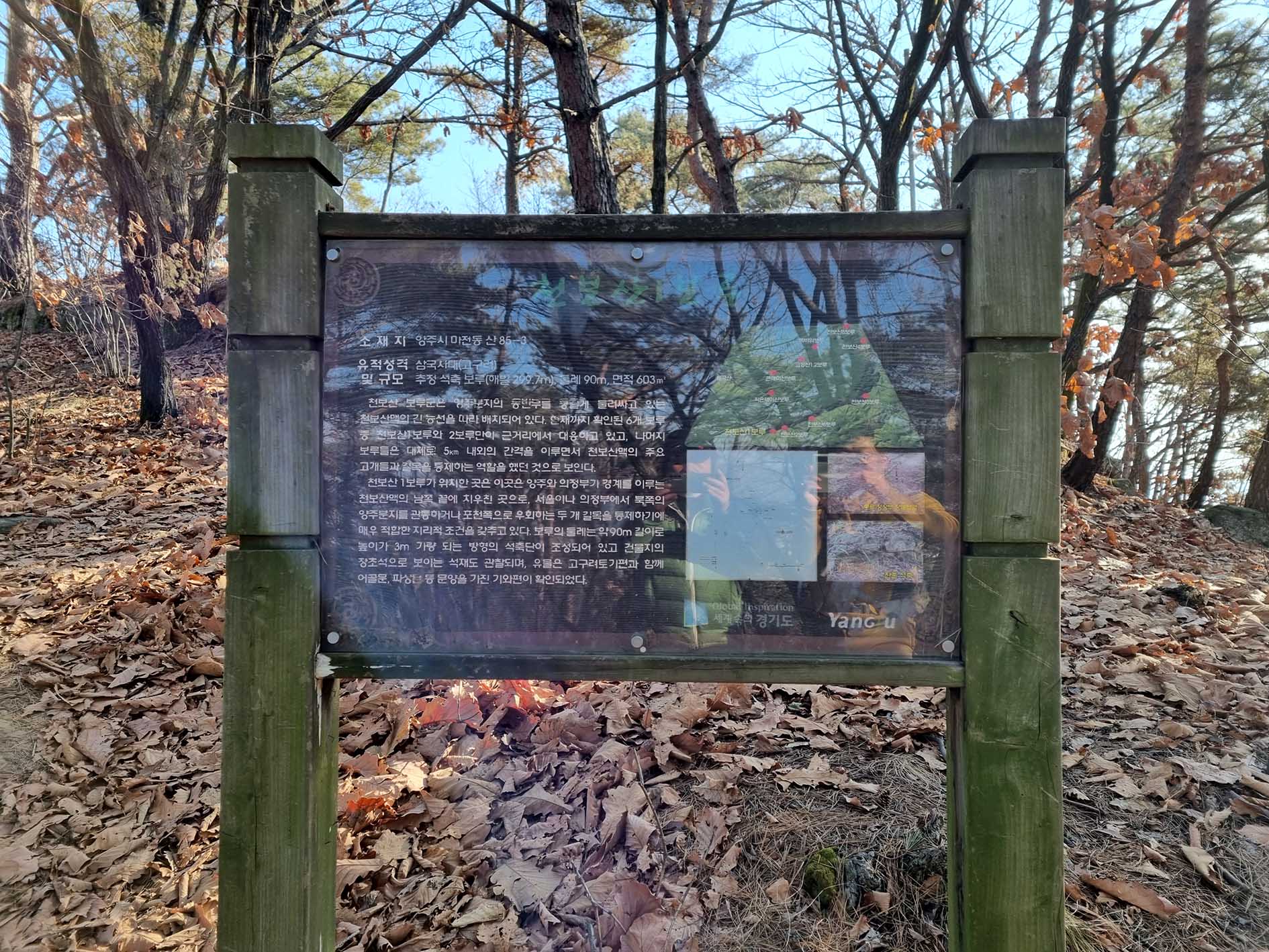 등산코스: 1구간(3.6km) : 양주역→마전동(삼밭골교차로)→천보산(마전동) 정상