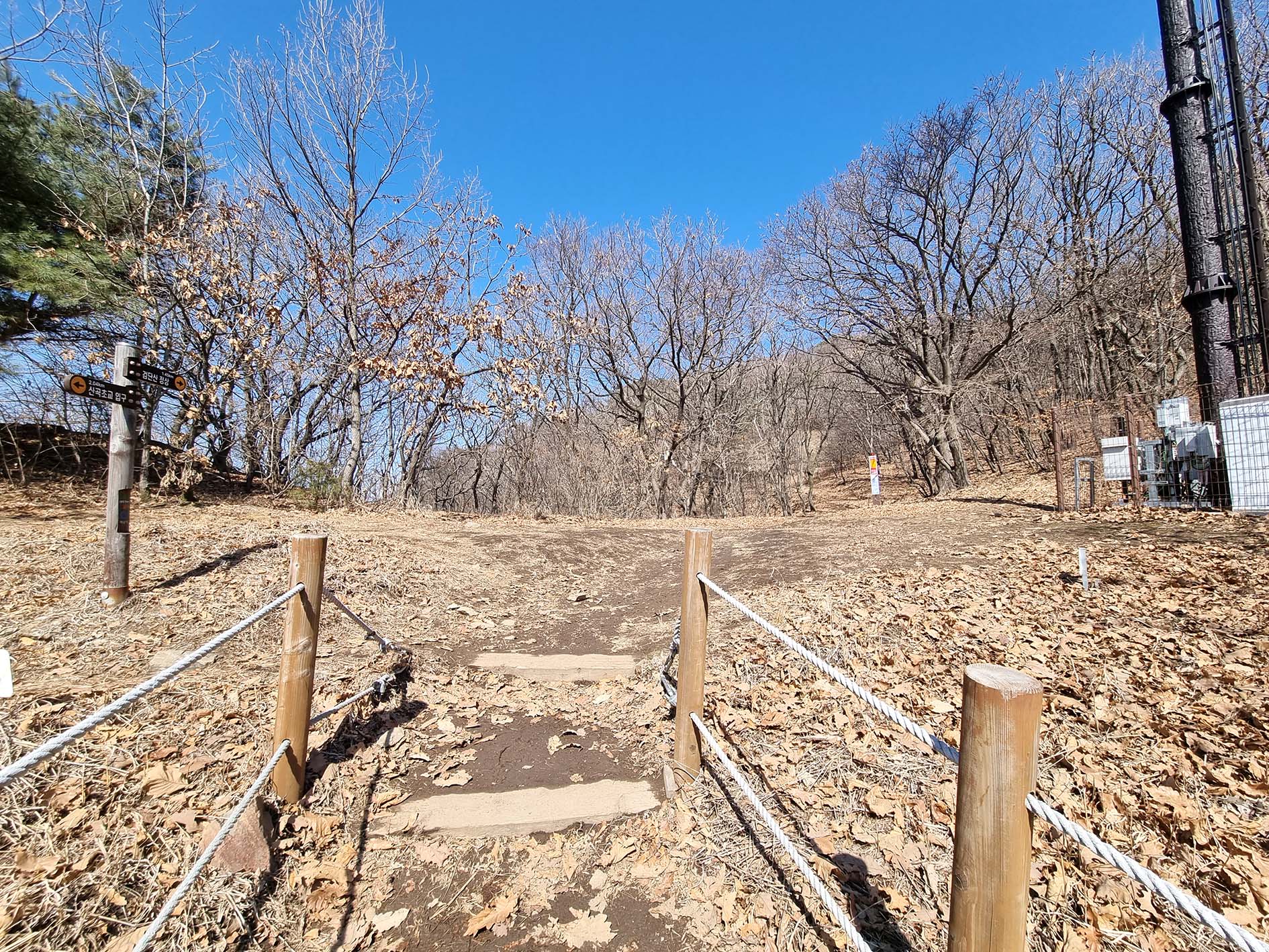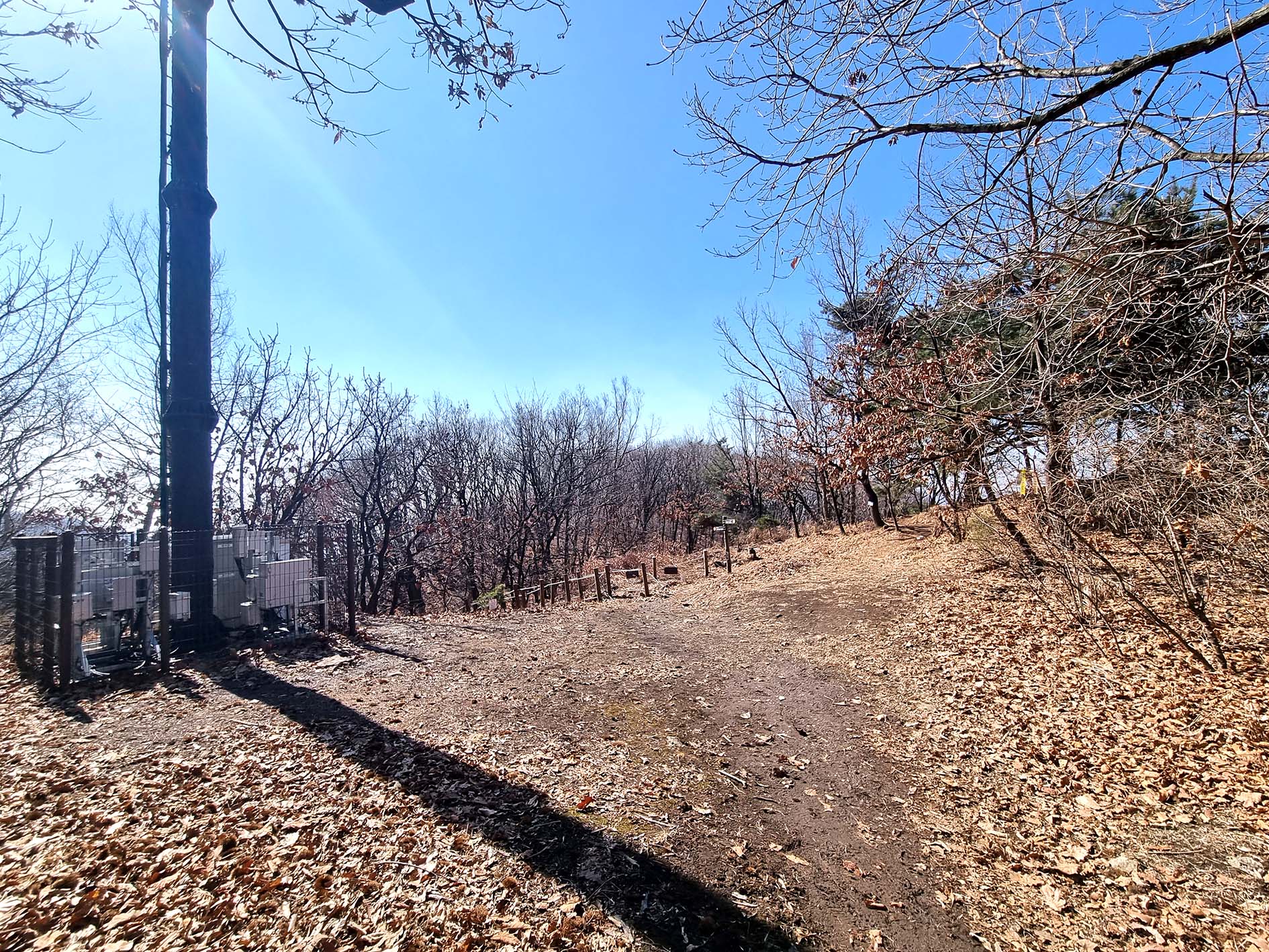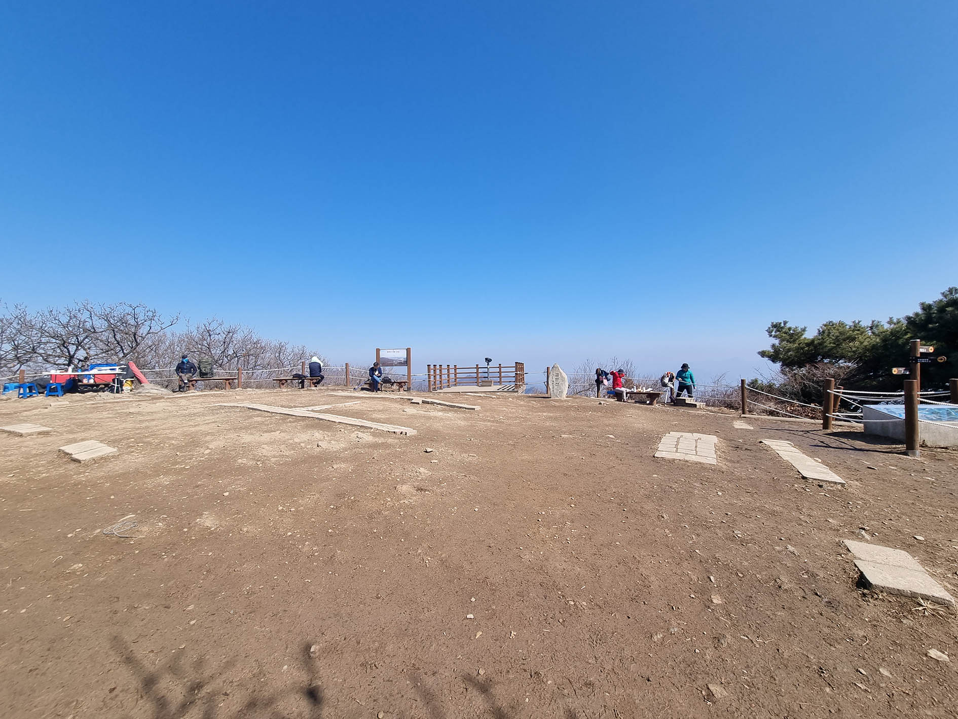 가파른 등산로는 산 중턱까지 이어지며 정상은 마당같이 평평하고 제법 널찍하다.