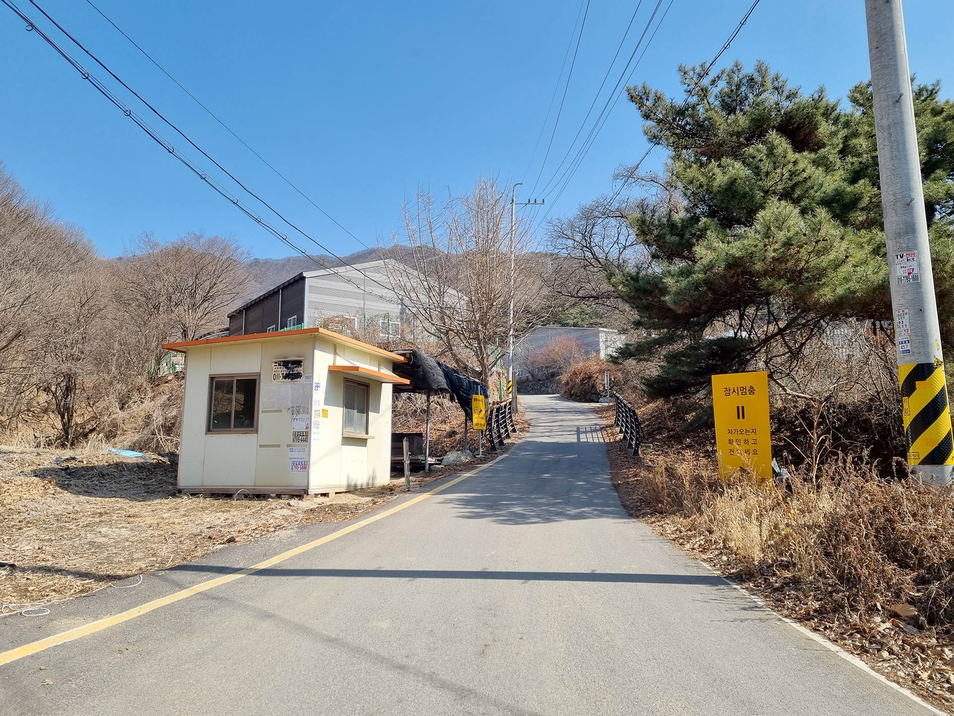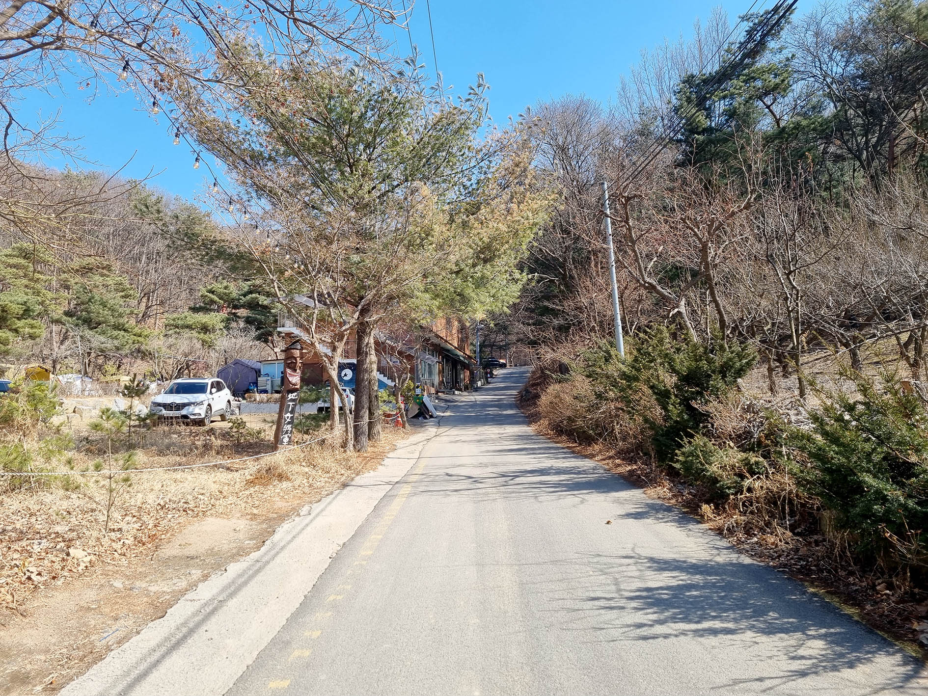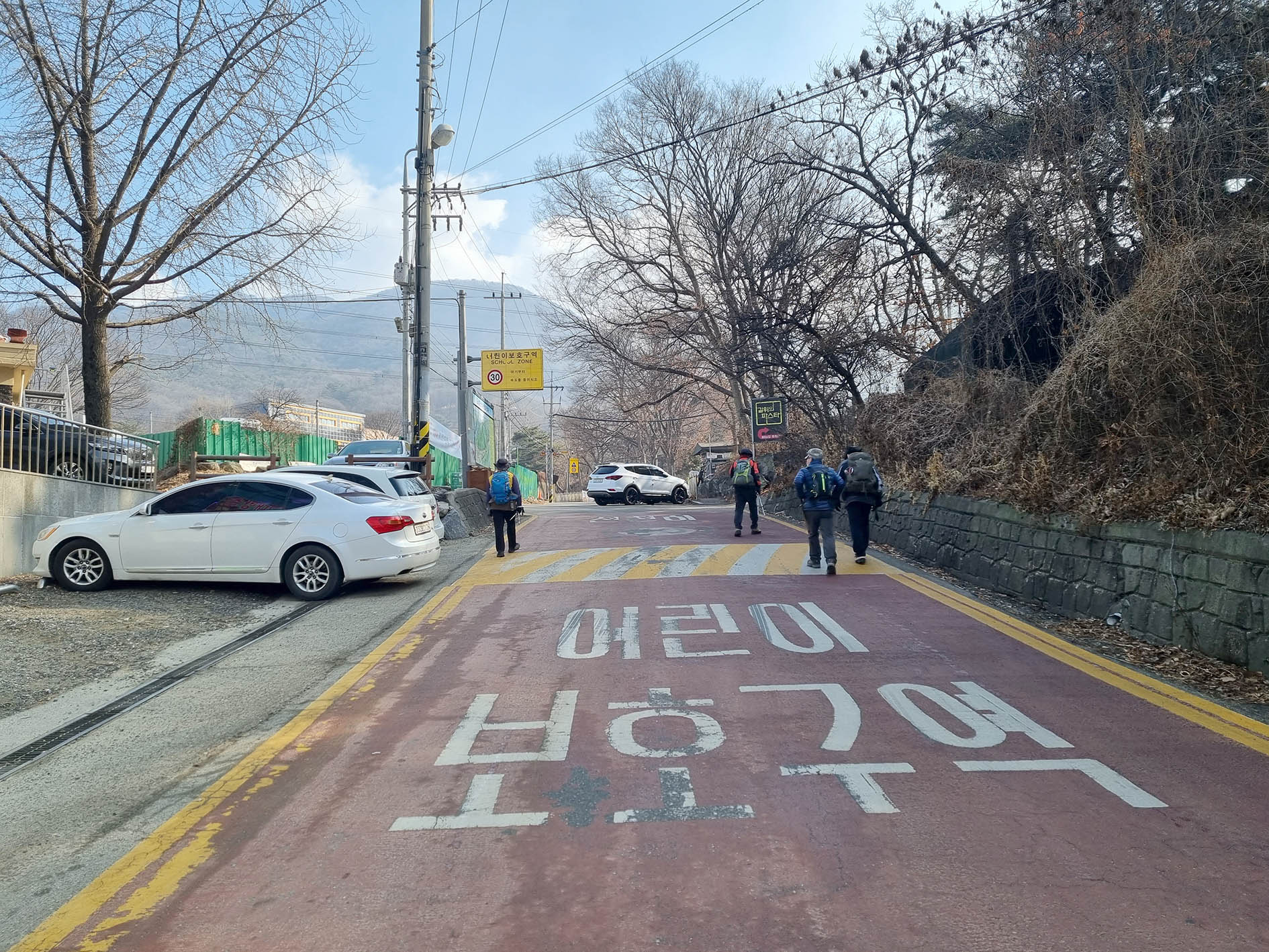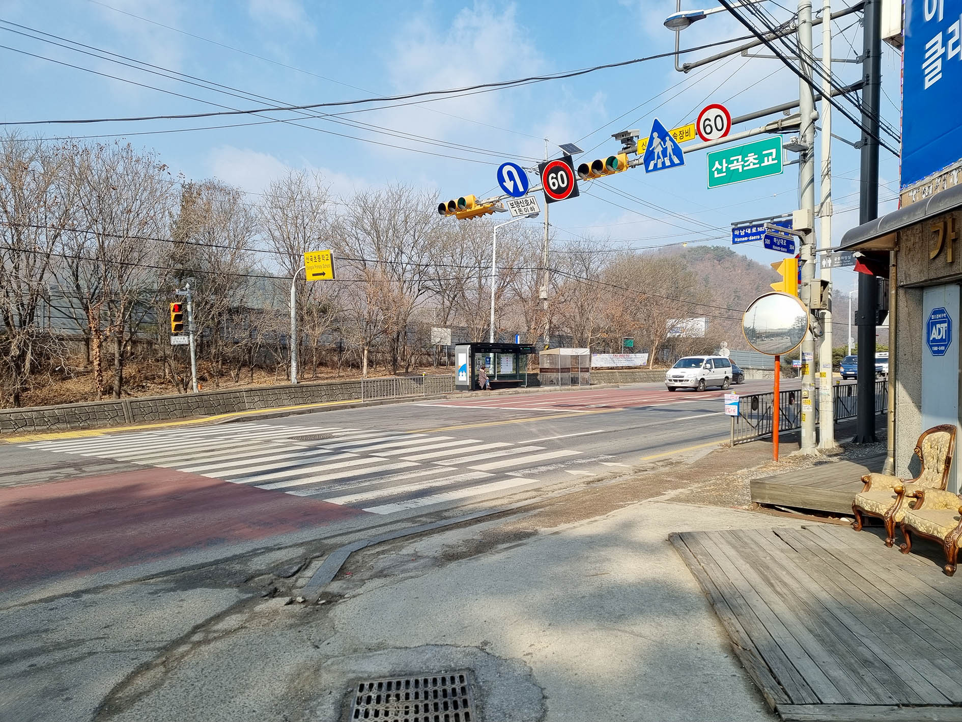 산곡 초교 버스정류장에서 내려 횡단보도를 건너 도로를 따라 들어간다.