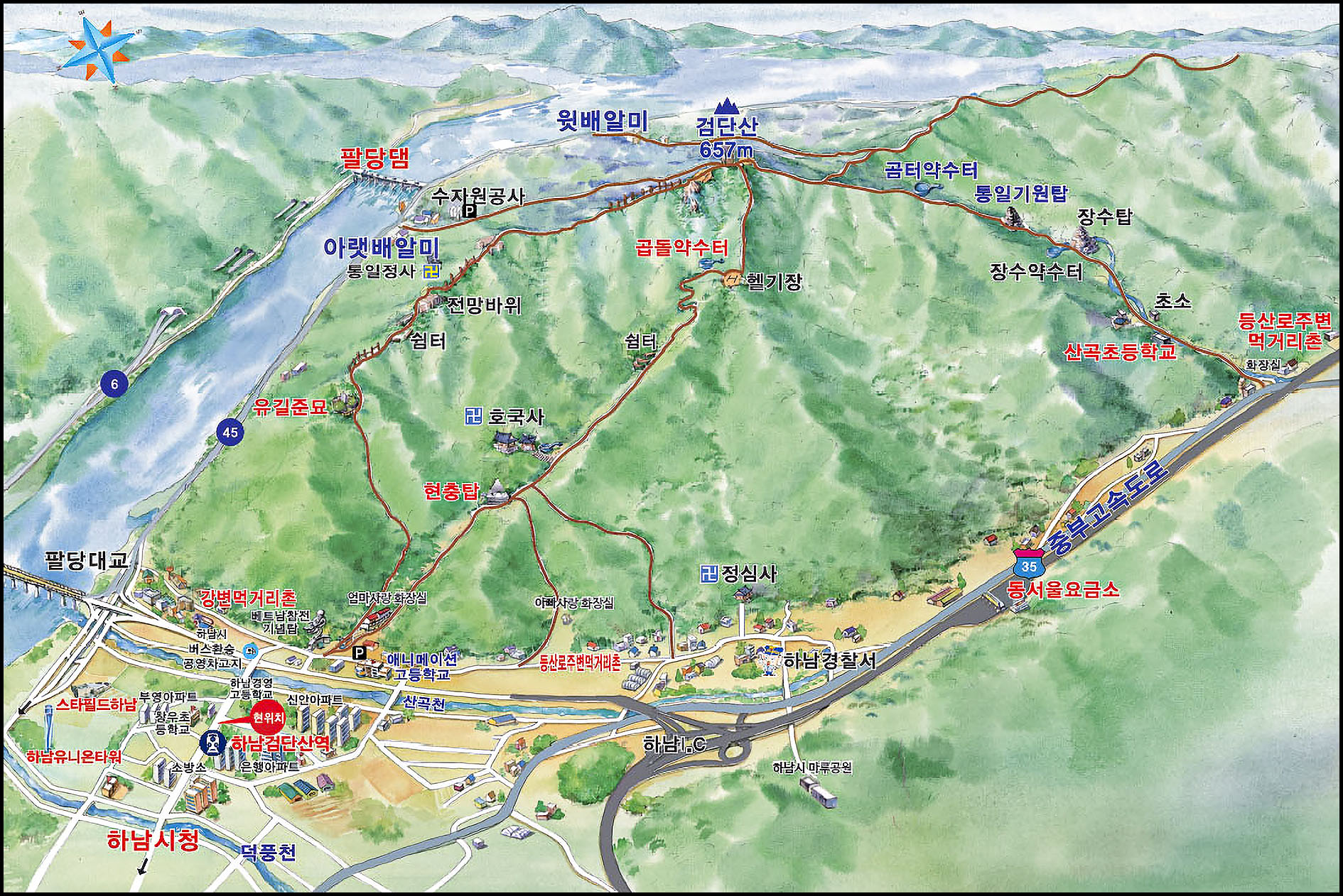 지하철 5호선 검단산역 하차 후 3번 출구로 나와 직진하여 다리를 건너