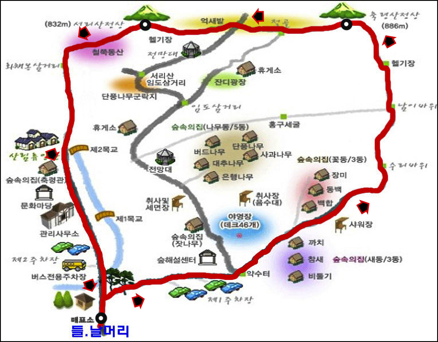 3, 일주코스 버스종점 - 주차장 - 자연휴양림 관리사무소 - 서릉 - 수리바위 -