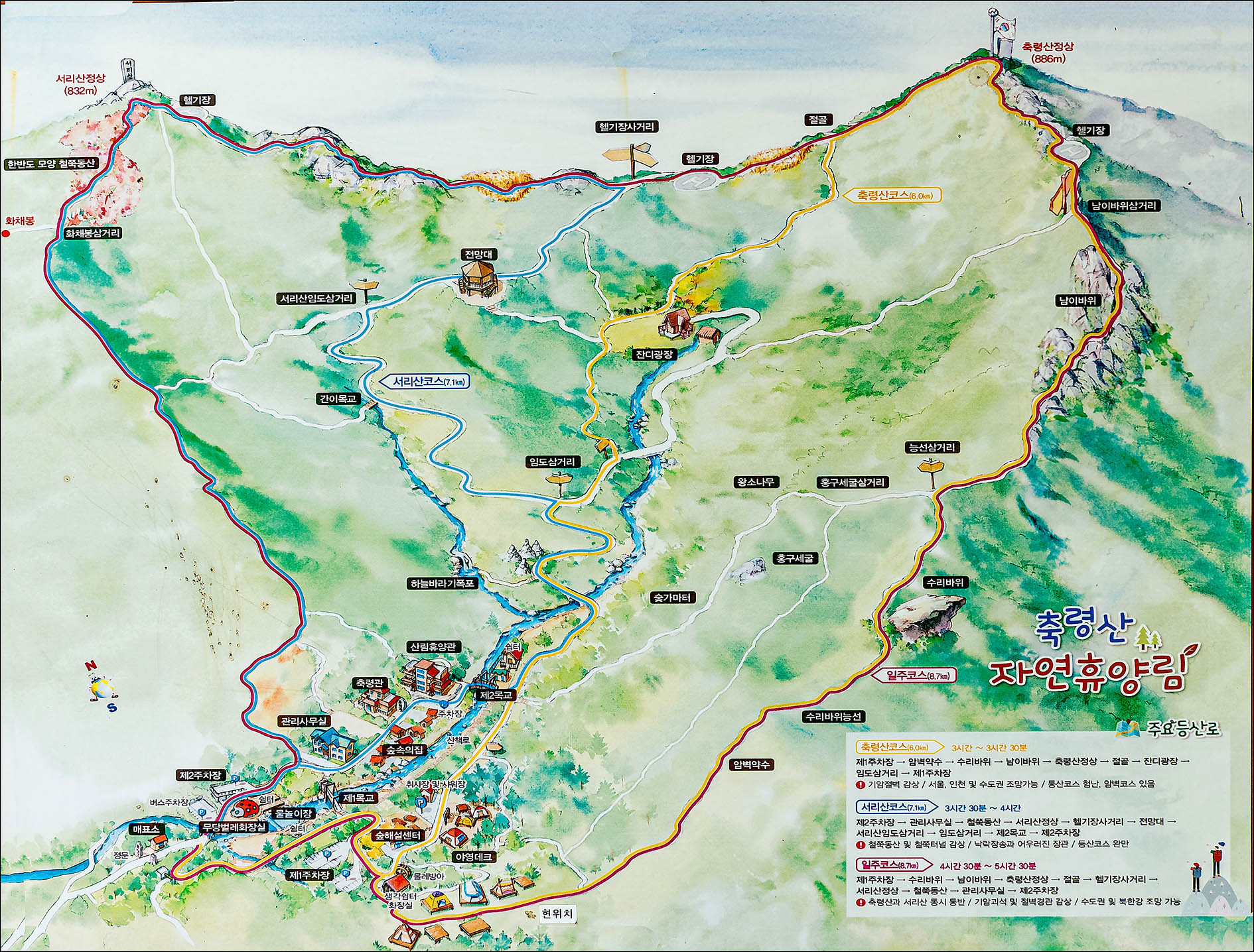 높이: 축령산 886m (100대 명산) 서리산 826m.