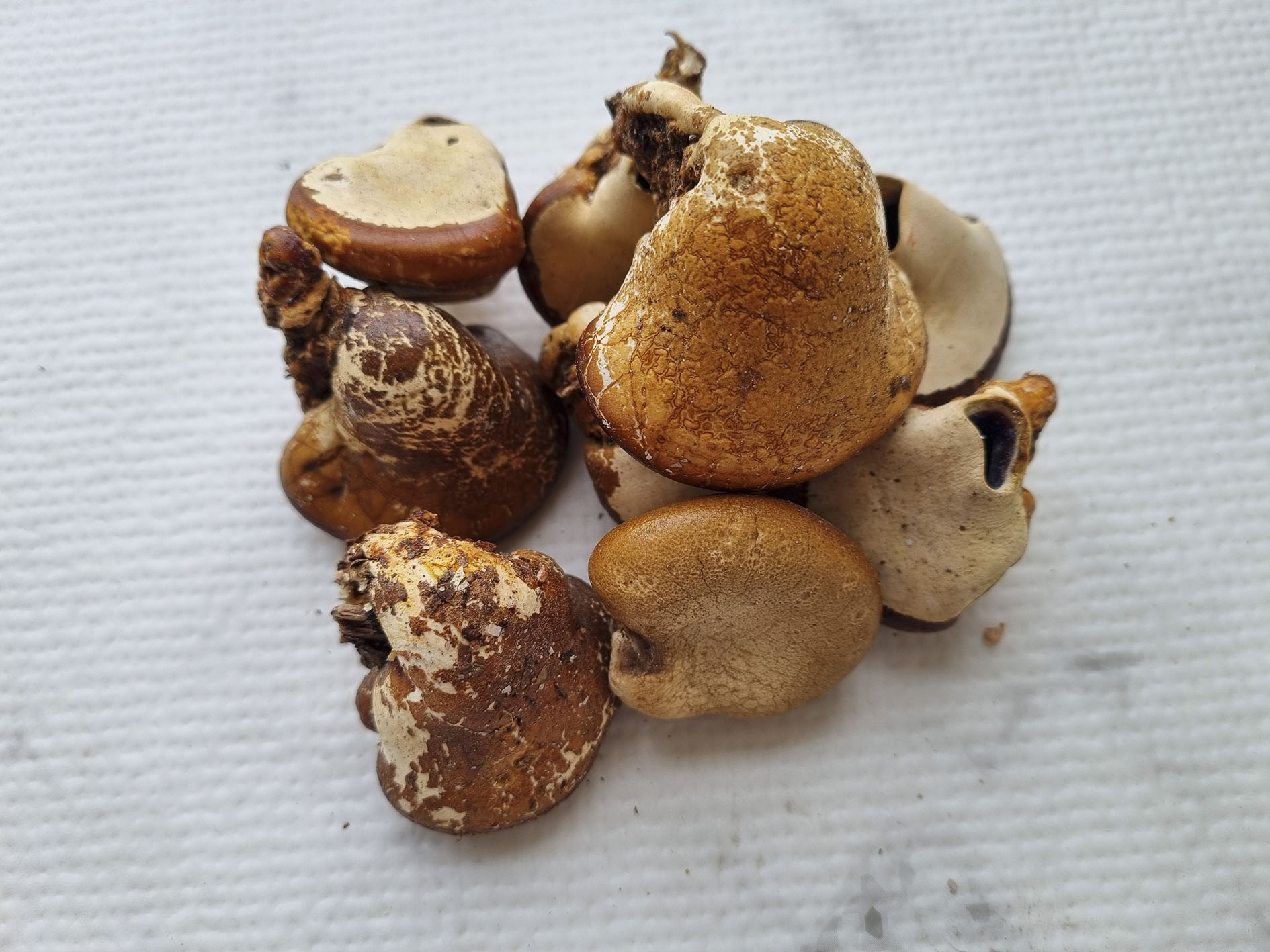 나중에는 밤톨이나 조개 모양이 붙어 있는 것처럼 보이며 배면은 흰색이다.