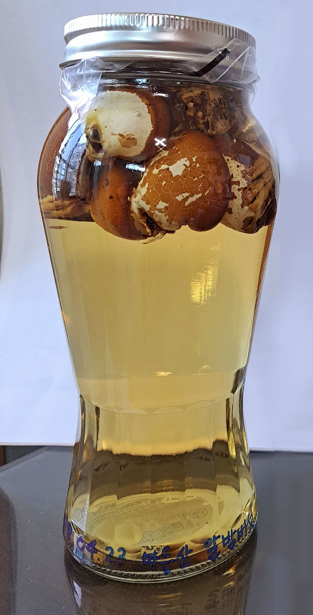 한입 버섯을 깨끗이 씻어 스팀 처리 후 말린 다음 담금술 2L에 한입 버섯 7~8개를 넣어